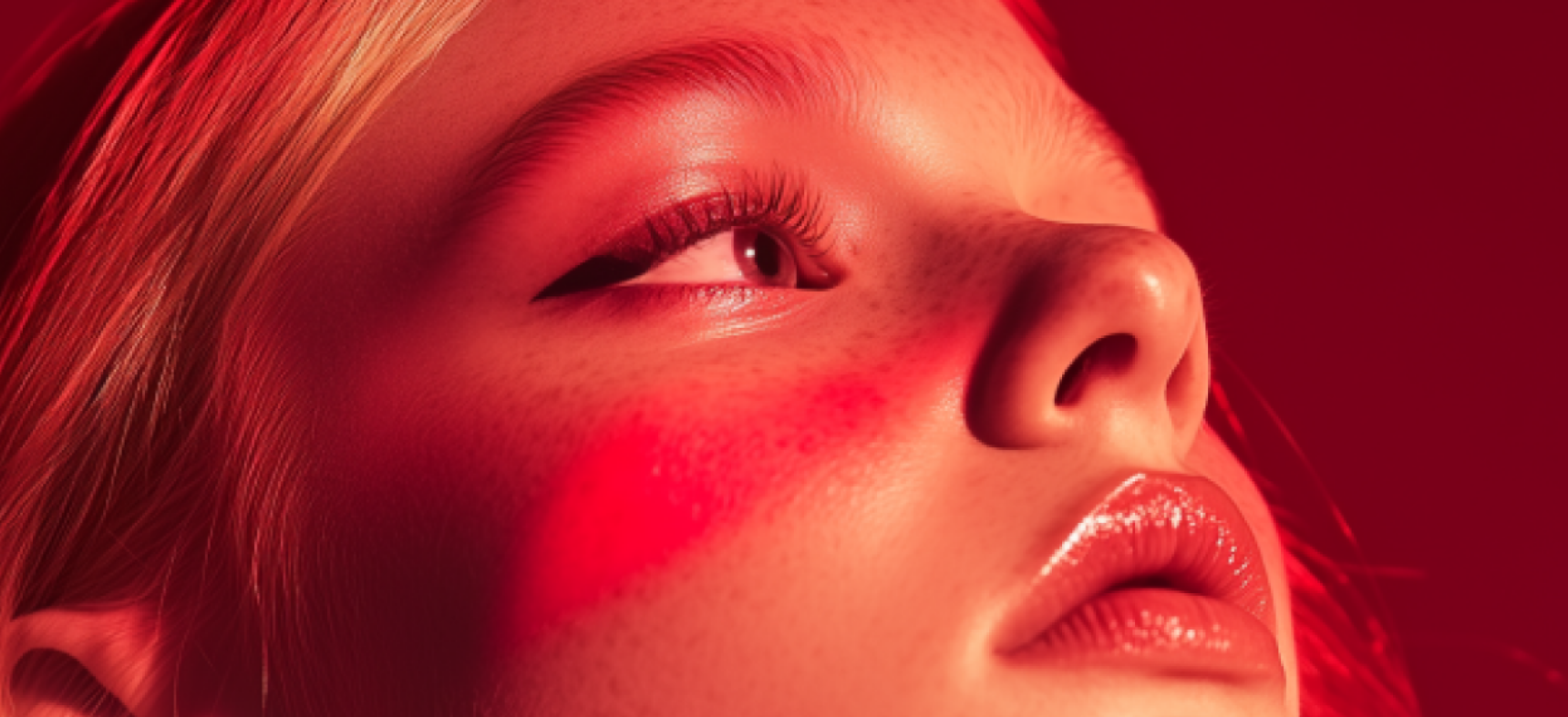Side profile of a person with curly hair against a gradient background of red and purple hues.